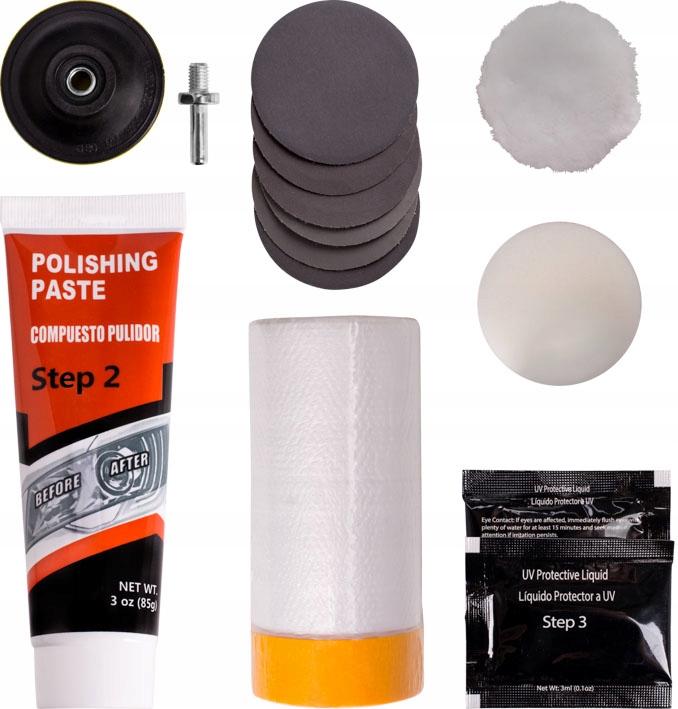 В этом наборе представлены все инструменты и материалы, необходимые для профессионального ремонта и защиты фар автомобиля.