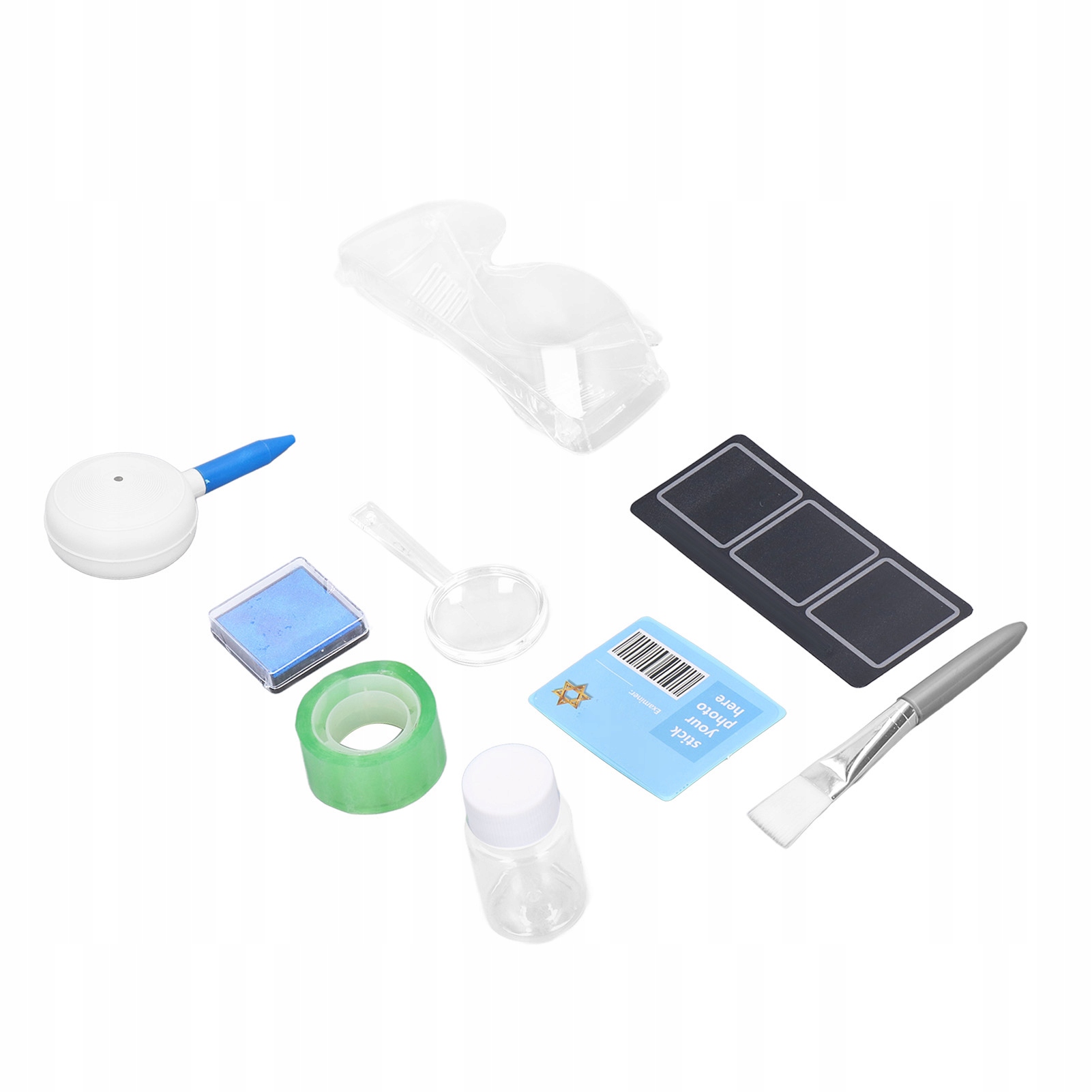 3. В комплекте: в комплект поставки входят очки для снятия отпечатков пальцев детей, кисточка, увеличительное стекло, бутылочка с порошком для пальцев и другие аксессуары.
