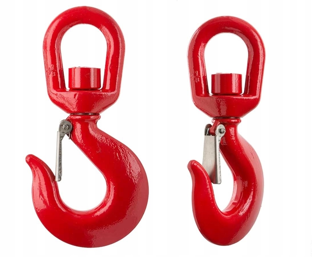 Крюк с поворотным звеном поворотного типа, позволяющим свободно вращаться вокруг своей оси, соединяя крючок с вертлюжком приваренной гайкой. Крючок имеет порошковое покрытие красного цвета, изготовлен из легированной стали 8-го класса прочности. Крюк оснащен пружинной собачкой, которая предотвращает высвобождение веревки или другой веревки под нагрузкой, что делает ее чрезвычайно безопасен в использовании.