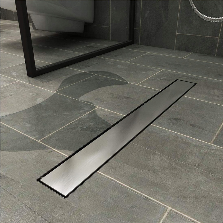 стальной линейный слив, крышка с выбранным рисунком толщиной 1,5 мм, сифон с корзиной и выпускным отверстием, выровненные ножки для правильного расположения слива, коврик водонепроницаемый, необходимый для правильной установки