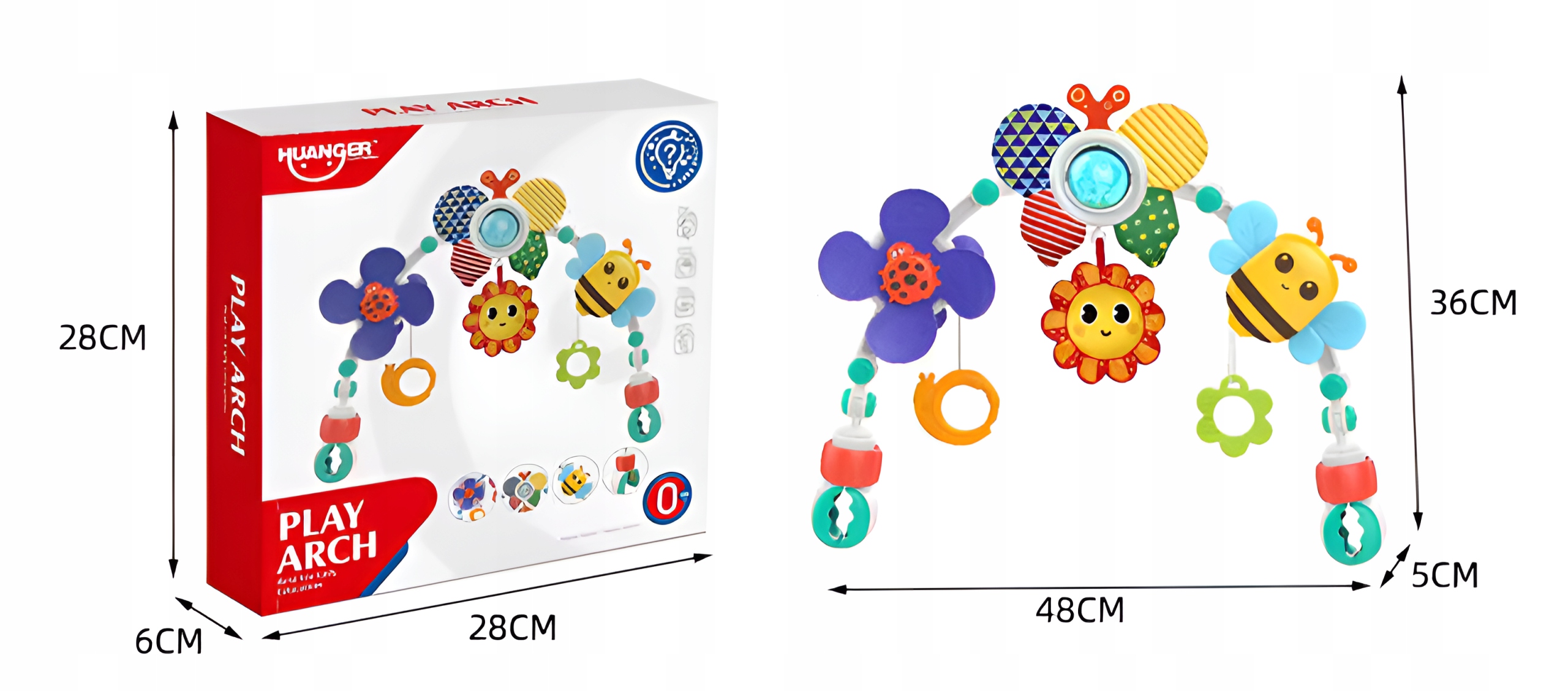 Красочная повязка на голову для коляски, автокресла или шезлонга — отличная идея для каждого малыша. Игрушка очень проста в сборке, а ее угол наклона можно регулировать под потребности каждого ребенка. Повязка на голову, к которой прикреплены красочные игрушки, побуждает хватать и вытягивать руки, развивает способность концентрировать внимание и формирует воображение ребенка. Игрушки, подвешенные на арке, позволят каждому ребенку развить крупную моторику, точные движения и чувства. Играя, ребенок учится различать формы и цвета.