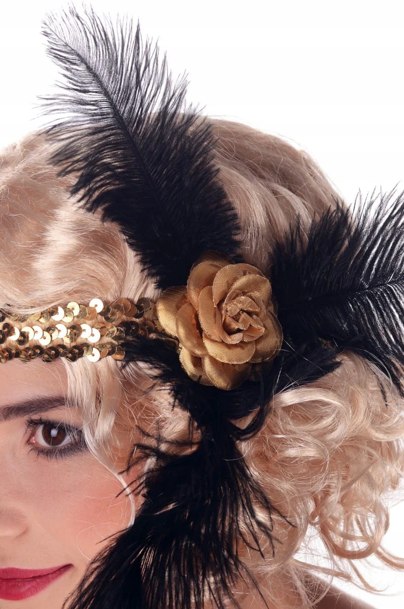 Повязка на голову с пайетками и вшитой резинкой. Ободок украшен перьями и розой из искусственной ткани.