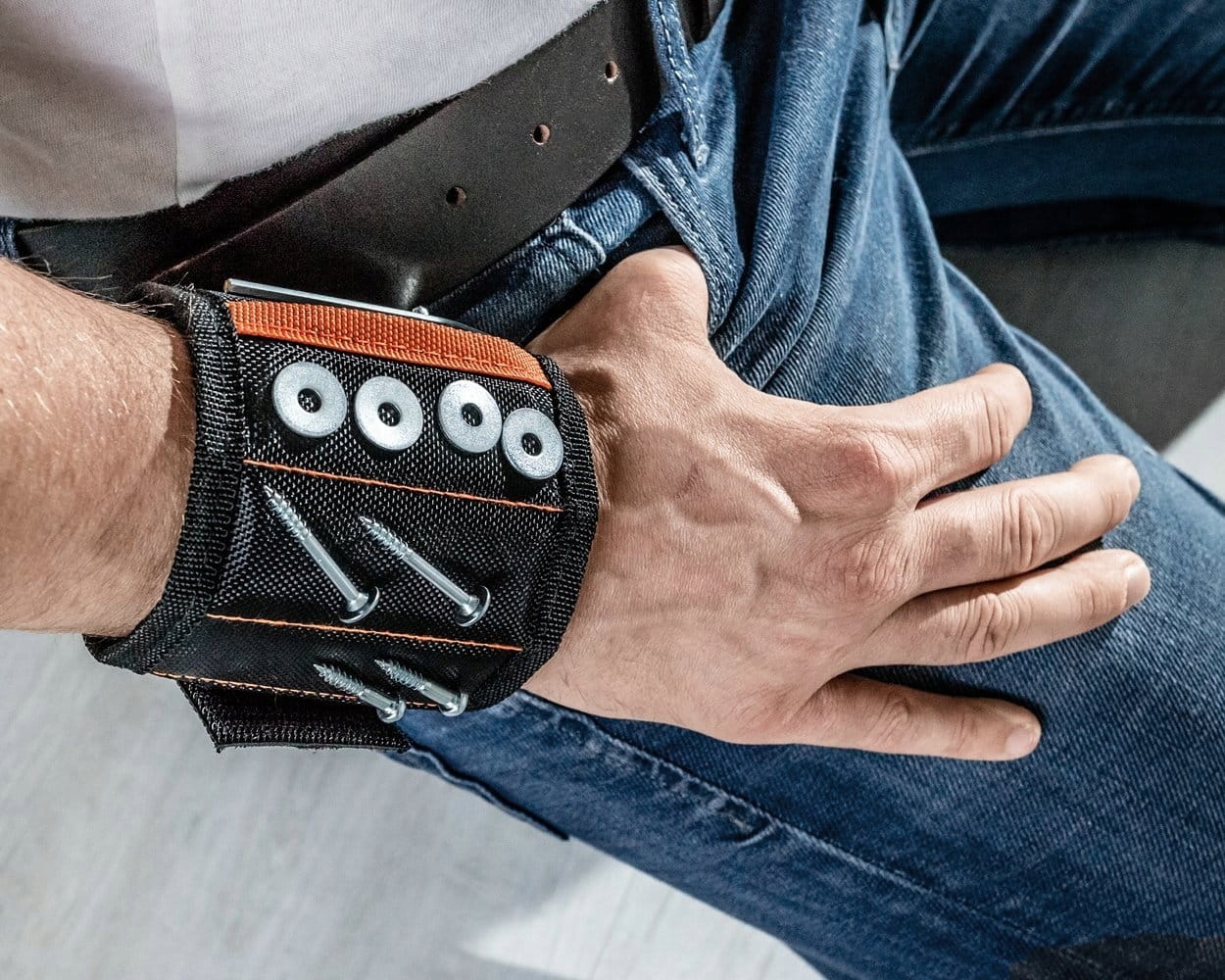 Браслет мастера — это браслет с вшитыми в него магнитами, изготовленный из прочного нейлонового волокна (поэтому прослужит долгие годы) и застегивающийся на липучке, что позволяет разместить его на руке любого человека. толщина. Благодаря этому все мелкие металлические элементы будут у нас на запястье, и когда они нам понадобятся, они будут под рукой.