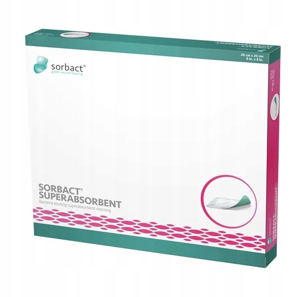 Сорбакт Суперабсорбент — стерильная повязка с суперабсорбентом, связывающим бактерии и грибки. Состоит из зеленого слоя Сорбакта, предназначенного для непосредственного контакта с раной, в сочетании с супервпитывающим внутренним слоем и белого водонепроницаемого наружного слоя, удерживающего экссудат внутри повязки. Повязка Sorbact Superabsorbent поглощает и удерживает экссудат, тем самым снижая риск мацерации (повреждения) тканей и поддерживая влажную среду в ране. Благодаря высокой впитывающей способности Сорбакт Суперабсорбент позволяет сократить частоту смены повязок. Повязку можно использовать при компрессионной терапии.
