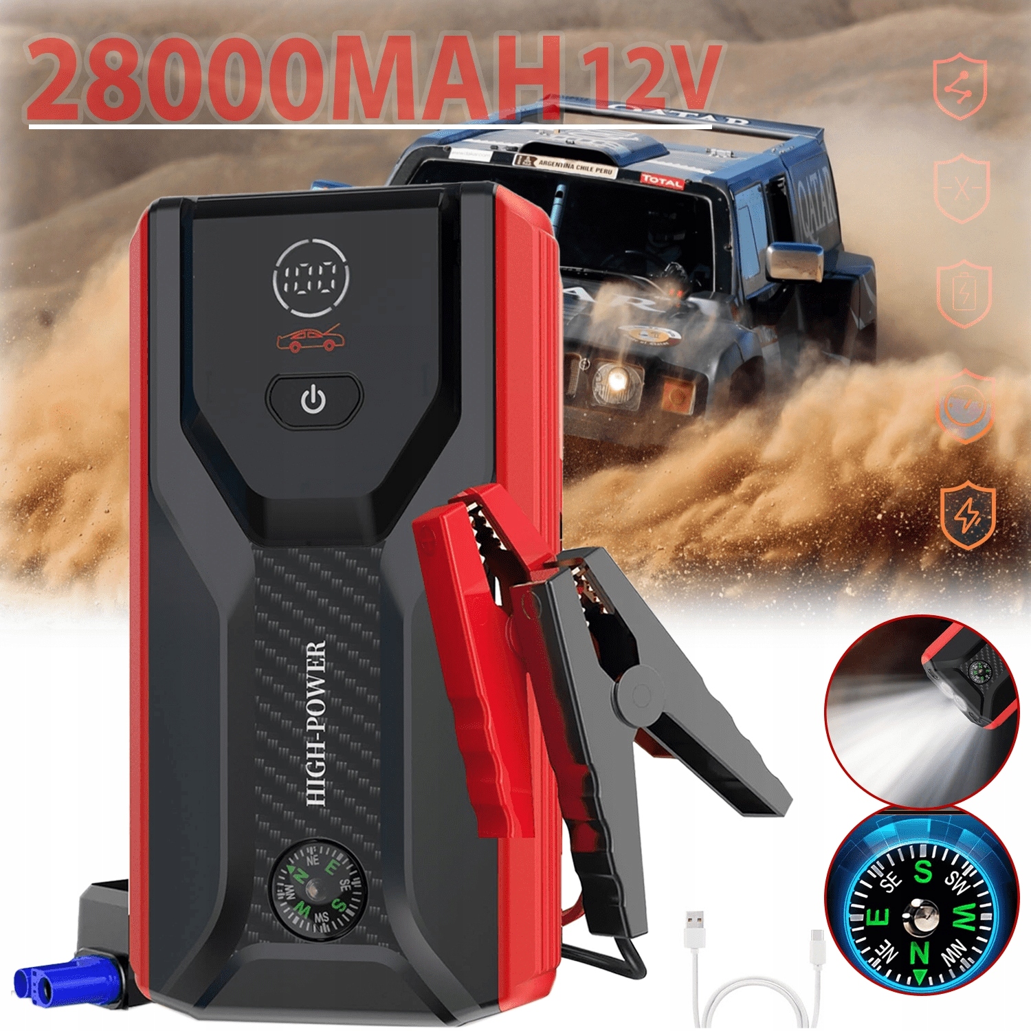 1. Сильный стартер автомобиля с вместимостью 28000 мАч: быстрый и легкий запуск пассажирских автомобилей, грузовиков, внедорожников, внедорожных транспортных средств и минивэнов, приводимых в силу 12 против.