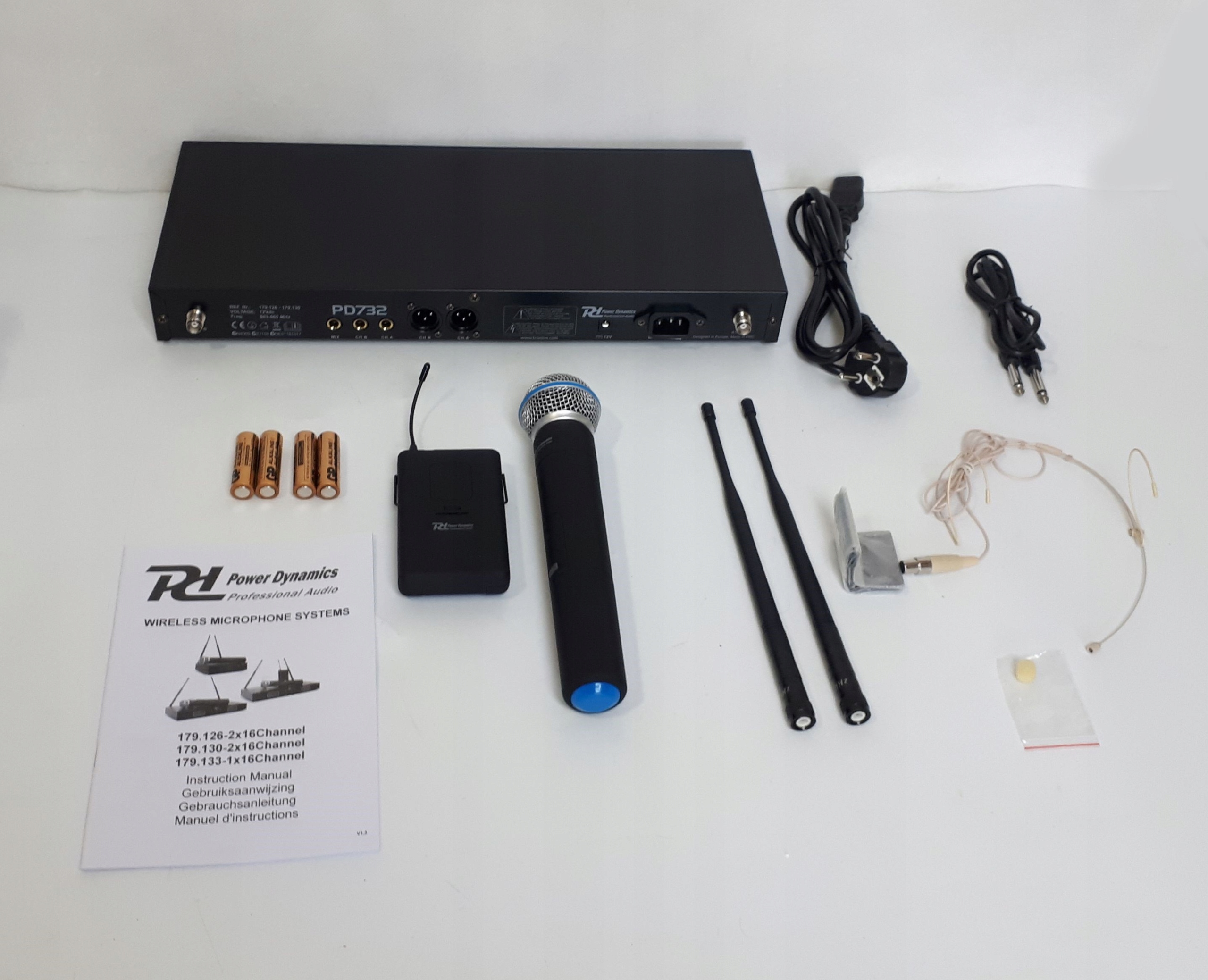 Power Dynamics PD732C — это профессиональная 2 x 16-канальная радиомикрофонная система, состоящая из карманного передатчика с электретным микрофоном для гарнитуры, ручного микрофона и Истинный приемник - разнесение.