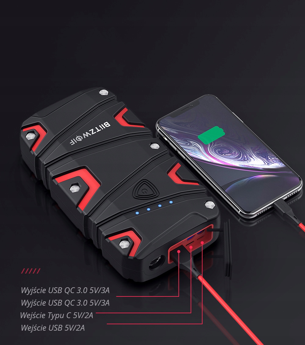 Стартер также можно использовать как аккумулятор. Благодаря технологии QC 3.0 оно будет заряжать ваше устройство гораздо быстрее, чем стандартное зарядное устройство. Изделие имеет 2 входа QC 3.0 с напряжением 5 В/3 А, вход типа C 5 В/2 А и вход micro USB 5 В/2 А.