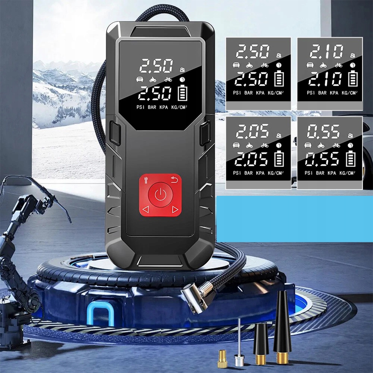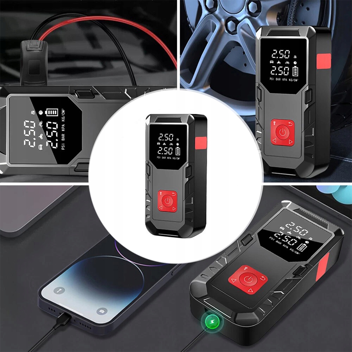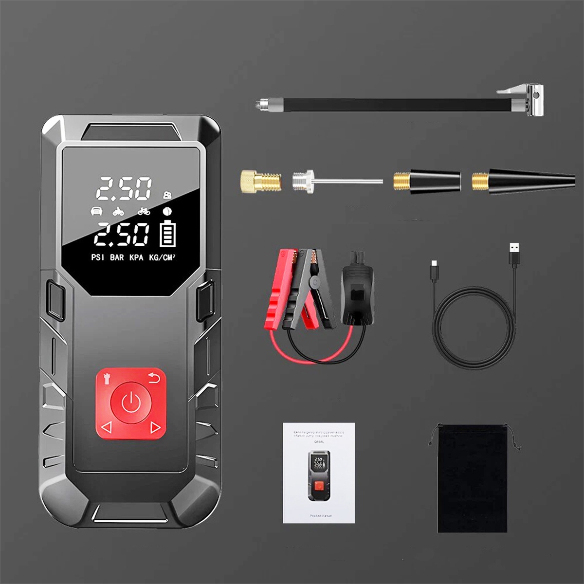 【Воздушный насос】 Устройство также можно использовать в качестве воздушного насоса. Он оснащен 4 различными дополнительными сопезами, 4 дополнительными блоками PSI, баром, KPA, кг/см2 и 4 предварительно предварительно накачанными режимами (велосипед, мотоцикл, автомобиль и мяч). Вы можете перекачивать автомобили, мотоциклы, велосипеды, плавательные колеса, каяки и различные шарики.