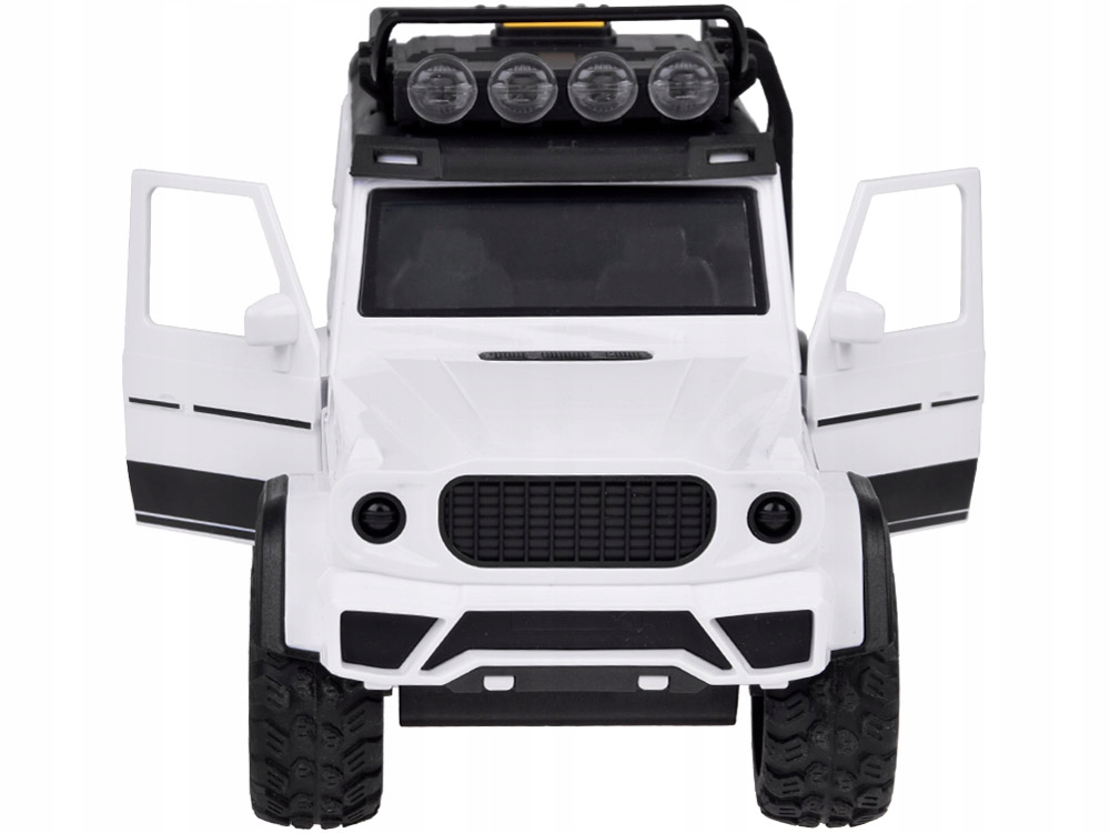 Внедорожник, созданный для развлечения каждого маленького водителя. Автомобиль сделан очень тщательно и качественно. Кузов автомобиля из белого пластика выглядит великолепно. На крыше имеется багажник и большие фонари, освещающие пространство перед автомобилем. У автомобиля открываются передние двери, есть звуковые эффекты и мигающие огни на крыше.