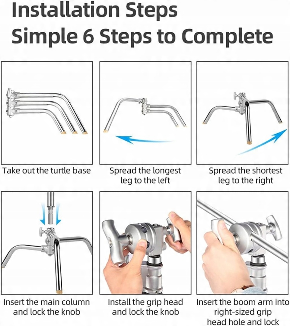 "c" Стенд с высокой нагрузкой: 100% металлическая стенда, она прочная и прочная, хромированная гладкая поверхность обеспечивает сопротивление износу и коррозии. Его максимальная грузоподъемность составляет 30 кг, поддерживает большинство фотографических устройств, таких как софтбоксы, зонтик, стробоп и вспышка.