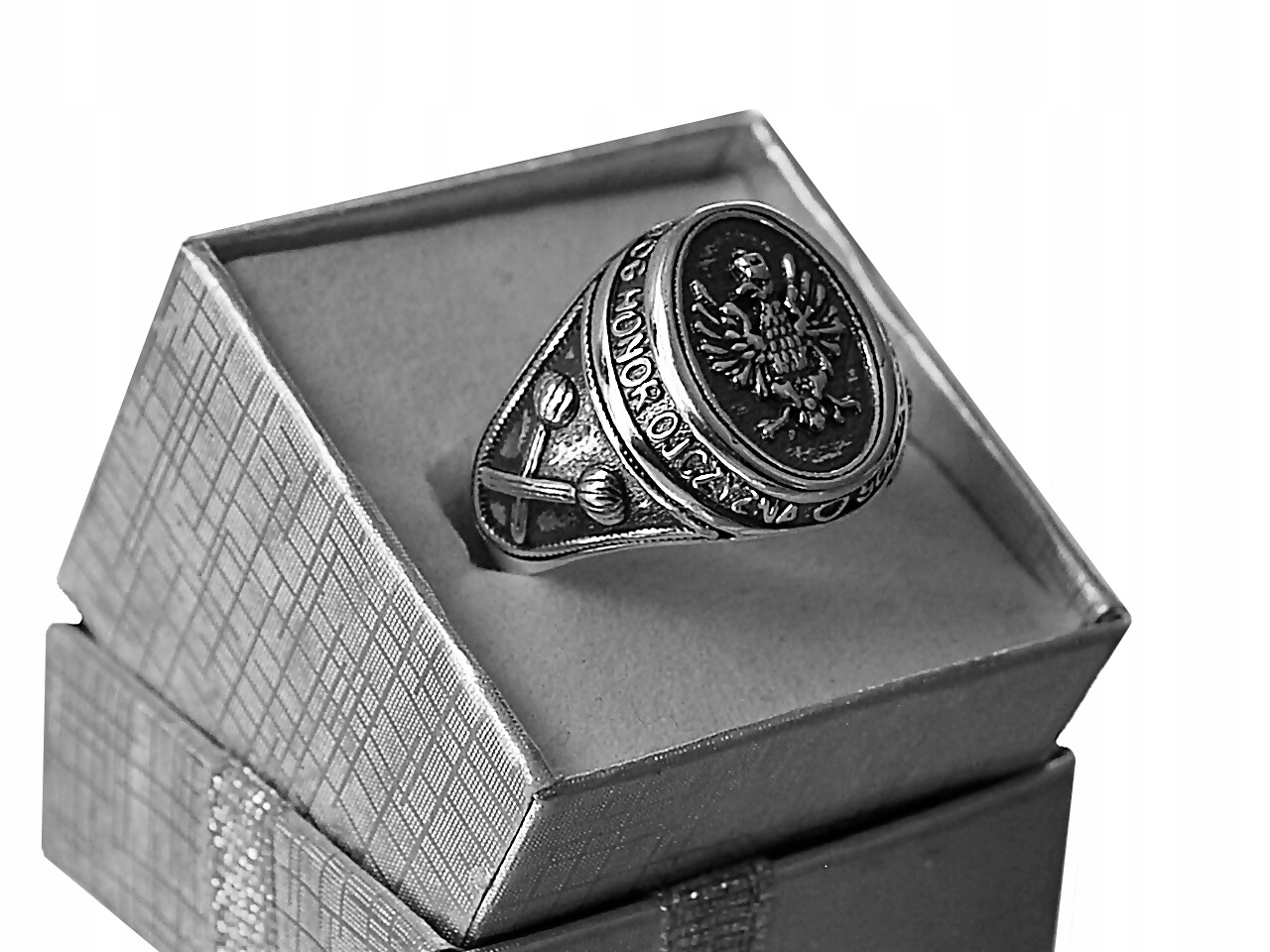 Патриотическая серебряная массивная знак с орлом, сделанным из чистого серебра, окисленного 925. Sygnet White Eagle в Короне и надпись: Бога честь Отека - сильный символ патриотизма и национальной гордости. По бокам есть пересеченные рулоны. подчеркните силу и решимость. Сделано очень внимательно и с вниманием к деталям. Новый с меткой ювелирных изделий впечатляет.