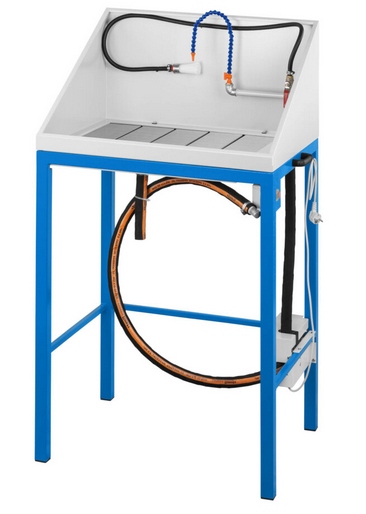 Моющуюся вещь кладут на перфорированную столешницу, под которой находится поддон для сбора капель. Жидкость, протекающая через щетку, растворяет и смывает жировые загрязнения, оставшиеся на промываемом изделии.