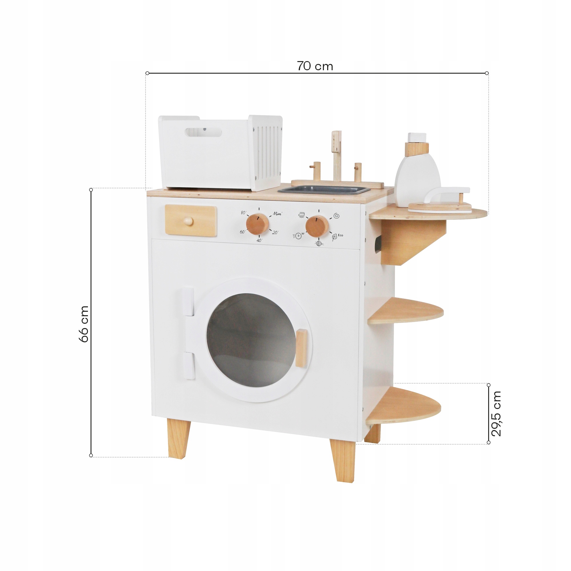 Стиральная машина также оснащена тремя полками, один из которых используется в качестве гладильной доски. Идеально подходит для кукольной одежды. Над ручками расположена выдвижная раковина с краном.Игрушка идеально подходит для обучения практической жизни.