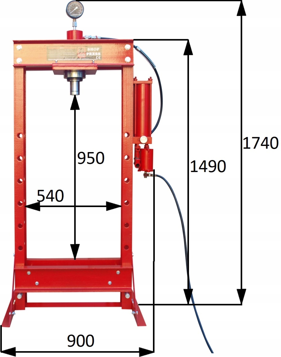 Накачивая вручную с помощью прилагаемого рычага или используя подаваемый воздух от компрессора с давлением около 8 бар (компрессор в комплект не входит), можно добиться того же эффекта - давление до 30 тонн - точно контролируемое манометром.