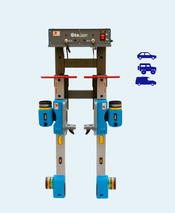 GTO Laser позволяет Вы можете проверить геометрию развал-схождения колес в автомобилях: легковых и так называемых минивэны, а также грузовые фургоны с колесными дисками диаметром от 12 до 20 дюймов. Это лазерно-механическое устройство, с помощью которого оптически с помощью низкоэнергетических полупроводниковых лазеров измеряются горизонтальные углы (схождение колес, смещение колес передней оси и отклонение геометрической ведущей оси от оси симметрии), а также вертикальные углы ( углы развала колес, кастор и наклон осей шкворня) механическим способом. Использование лазерных лучей позволяет проводить измерения даже при очень интенсивном солнечном свете. Используемые лазеры полностью безопасны. Измерительные блоки питаются от аккумуляторов нового поколения (без эффекта памяти). Зарядка и перезарядка аккумулятора происходит полностью автоматически после размещения измерительных блоков на станциях хранения.