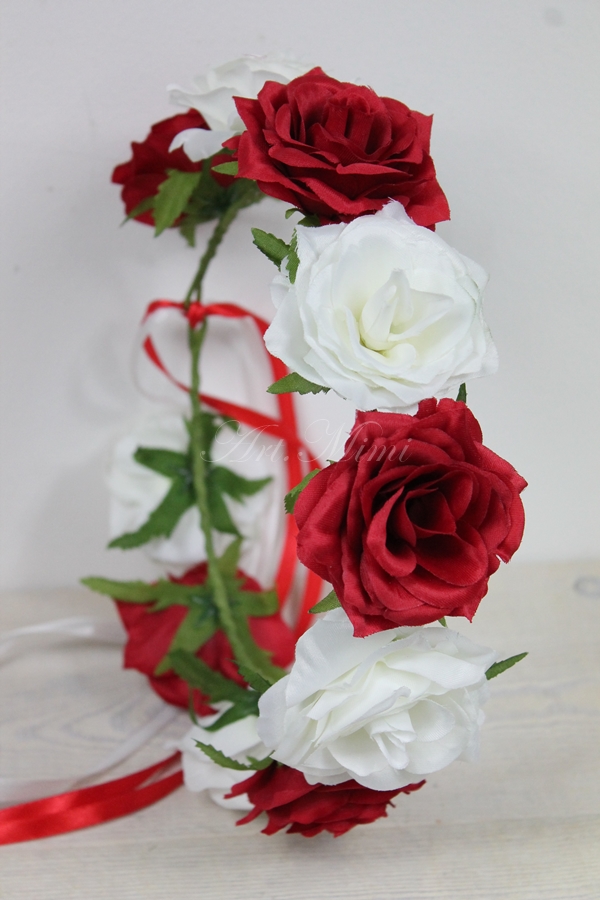 Очень красивый и большой венок из слегка блестящих атласных роз белого и красного цвета, украшенный лентой в тон роз.