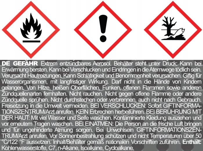 - Продукт содержит смесь горючих газов (углеводороды, C7, н-алканы, изоалканы, циклические соединения, пропан-2-ол, изобутан, диоксид углерода, пропан, н-гексан), поэтому его следует использовать с осторожность.