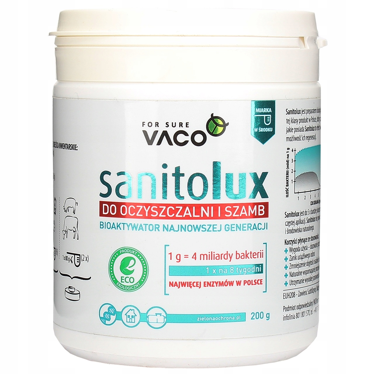 Vaco sanitolux является биологическим препаратом последнего поколения для домашних сточных вод, скота и септических резервуаров. Это единственный продукт этого класса в Польше, который содержит наиболее эффективные штаммы бактерий и самая высокая концентрация активных ферментов . Превосходные свойства, которые он обладает sanitolux , является результатом многолетнего опыта и исследований. Подготовка поддерживает естественные процессы очистки сточных вод и активирует возможность их регенерации.