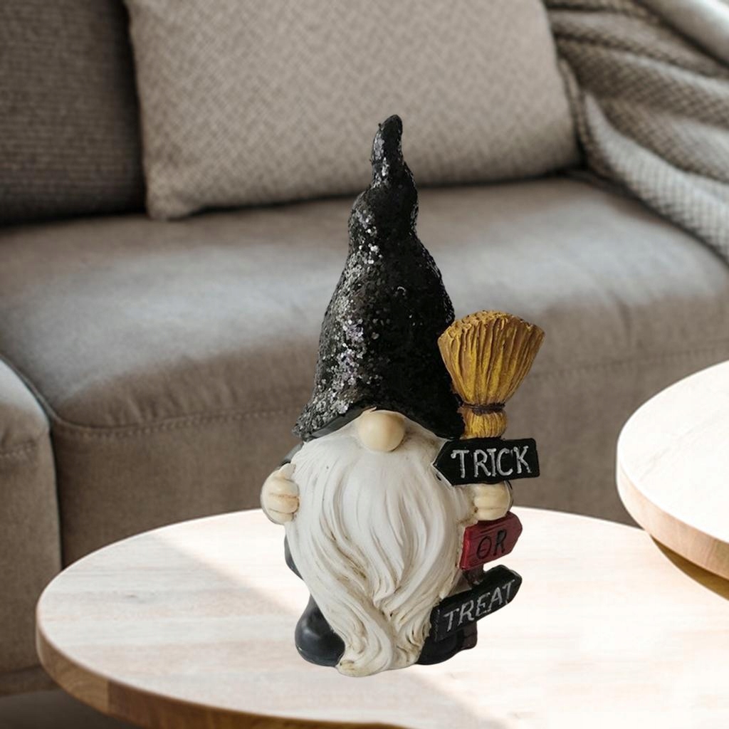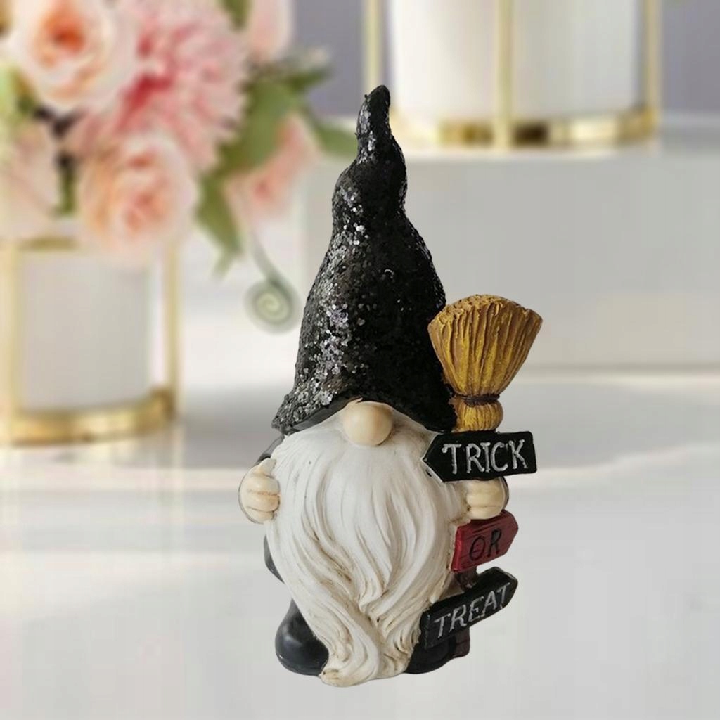 -a Черный карлик с метлой в ручной теме Хэллоуина «Трюк или лечение» Ституя Скульптура для внутреннего украшения или за пределами орнамента