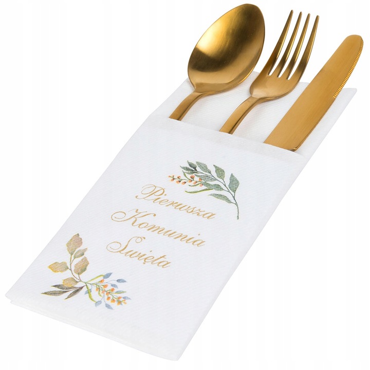 Корматы из бумажных столовых приборов с золотой надписью Первое святое причастие.