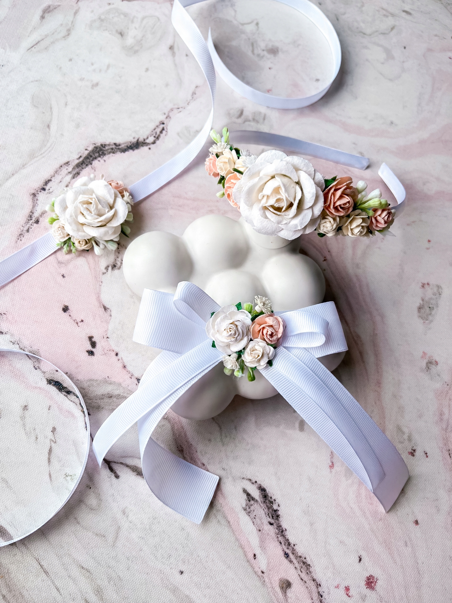 Красивый набор причастия ручной работы, который добавит очарование и элегантность каждой девушке во время первого святого причастия. Cammandion Band - тонкая белая полоса, украшенная цветами в оттенках белого, порошкового розового и персика. Легкие и удобные, идеально адаптируются к голове, красиво представляя как с свободными волосами, так и с шпилькой. Цветочное украшение с деликатными розами в пастельных тонах идеально дополняет всю стилизацию причастия.