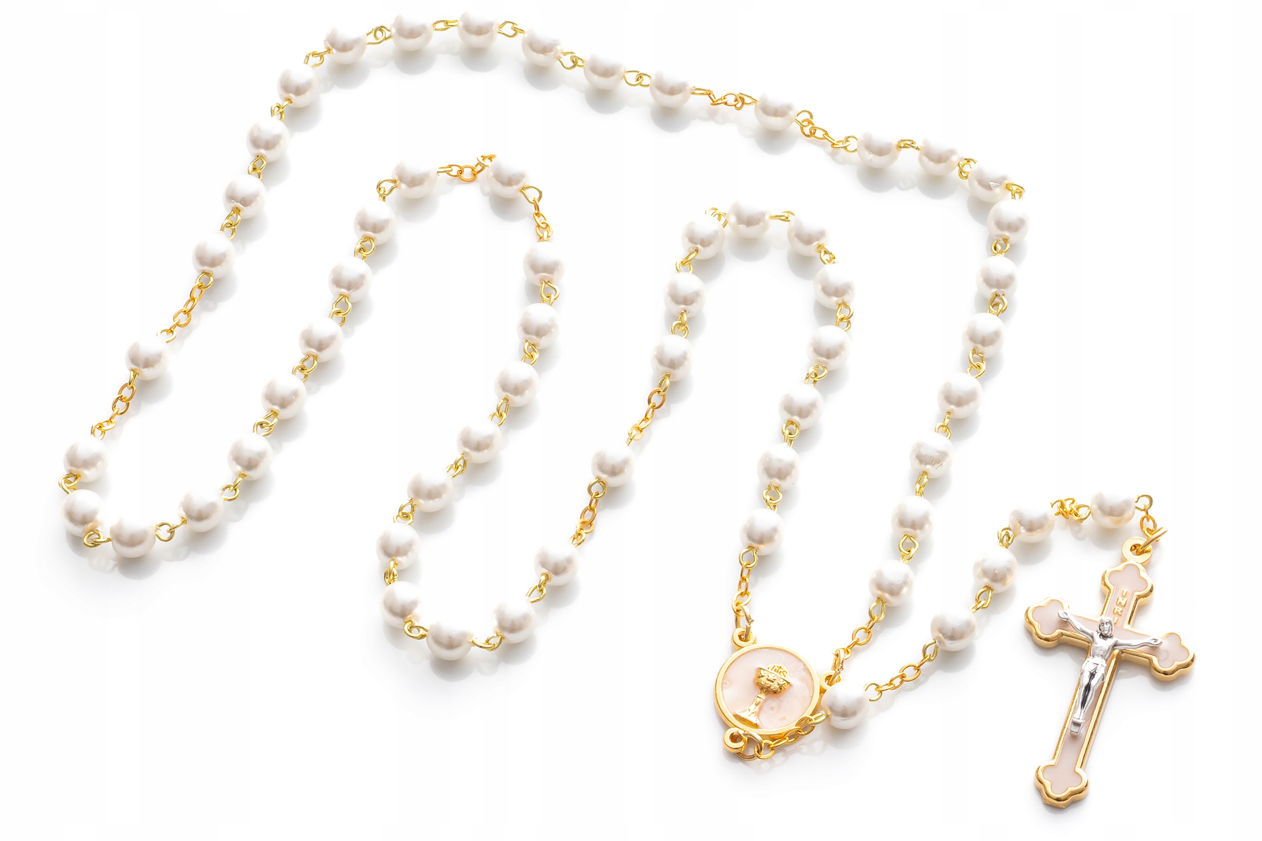 Чётки к Первому Причастию для девочки. Бусы из круглых жемчужных бусин с крестиком и перламутровым соединителем. Четки станут не только прекрасным подарком к Первому Святому Причастию, но и инструментом для красивой детской молитвы.