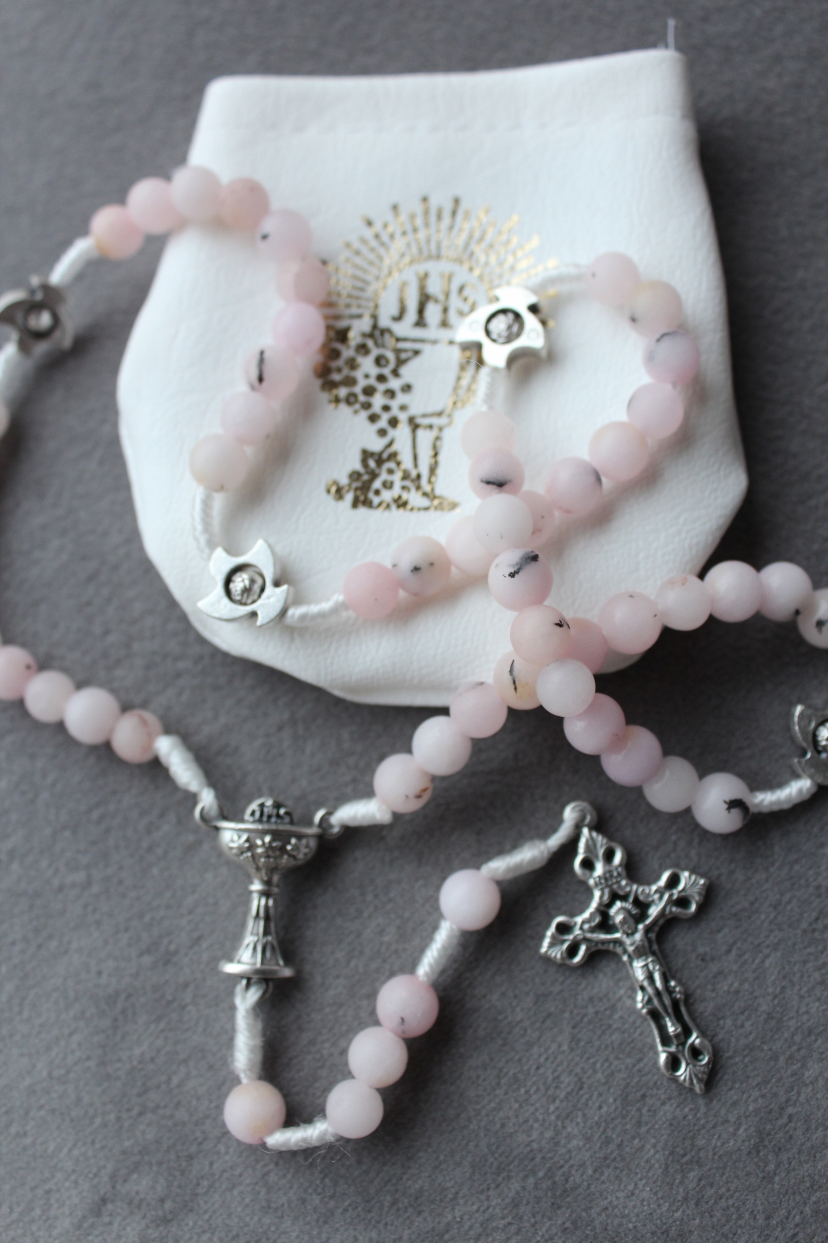 ПРИЧАСТЯ РОЗАРІЙ Святе причастя з каміння РОЖЕВИЙ ОПАЛ IHS + футляр