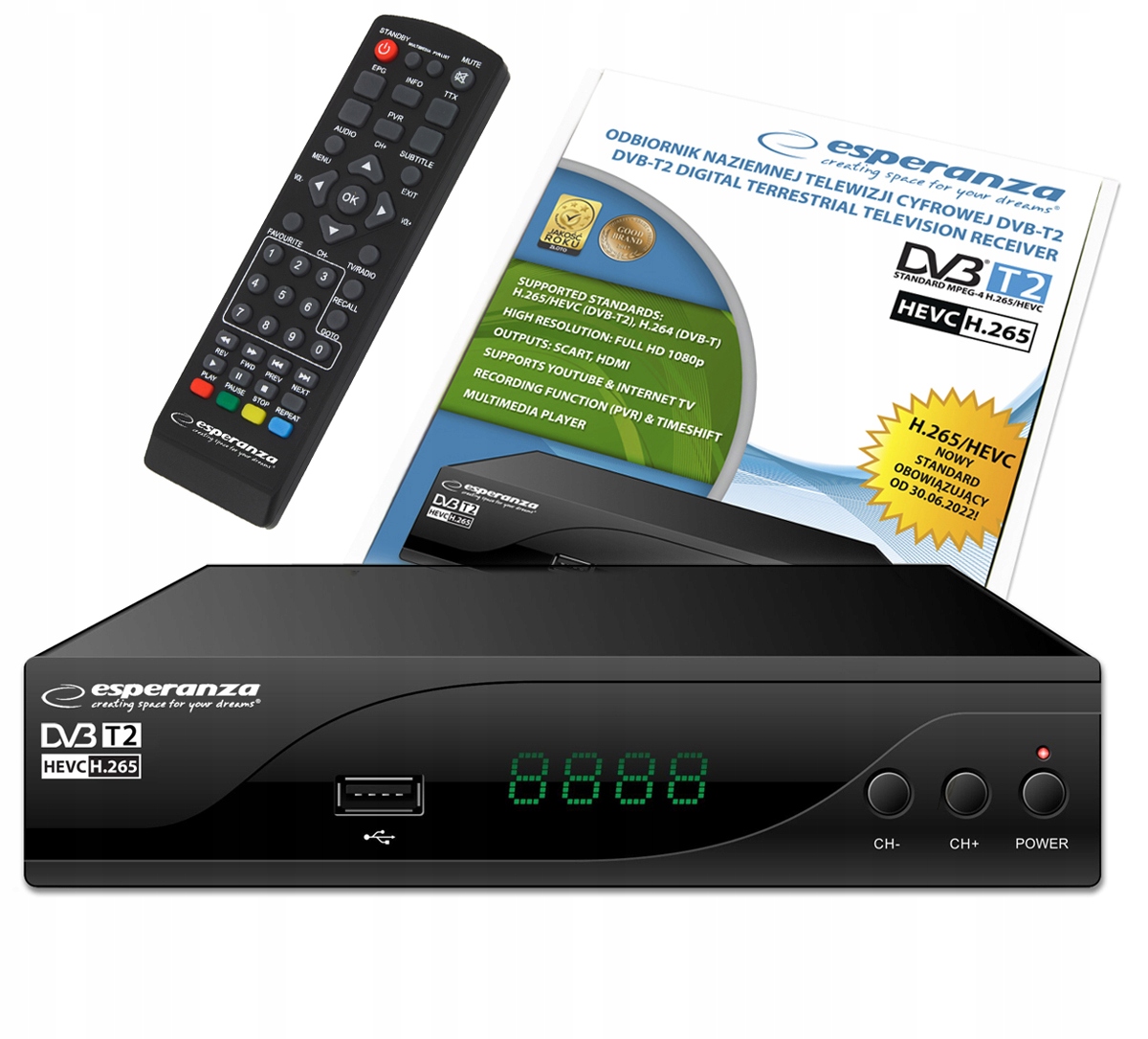 Последняя, современная версия декодера цифрового наземного телевидения DVBT/T2 с дисплеем. Он обеспечивает прием бесплатного цифрового наземного телевидения высокой четкости в стандартах MPEG-2, MPEG-4 H.264/AVC и H.265/HEVC. Воспроизводит звук, совместимый с MPEG-1 (уровни 1,2,3), AAC, E-AC3. Имеет встроенную функцию записи программ (Personal Video Recording) в цифровом качестве с возможностью отложенного воспроизведения (Timeshift). Все функции легко доступны в меню и непосредственно с функционального пульта дистанционного управления. Декодер оснащен портом USB, позволяющим подключать внешние носители информации и записывать или воспроизводить с них файлы и фотографии, а также портом Ethernet, позволяющим подключать декодер к сети Интернет. Он имеет встроенные разъемы SCART и HDMI, поэтому работает с большинством ТВ-ресиверов, доступных на рынке.