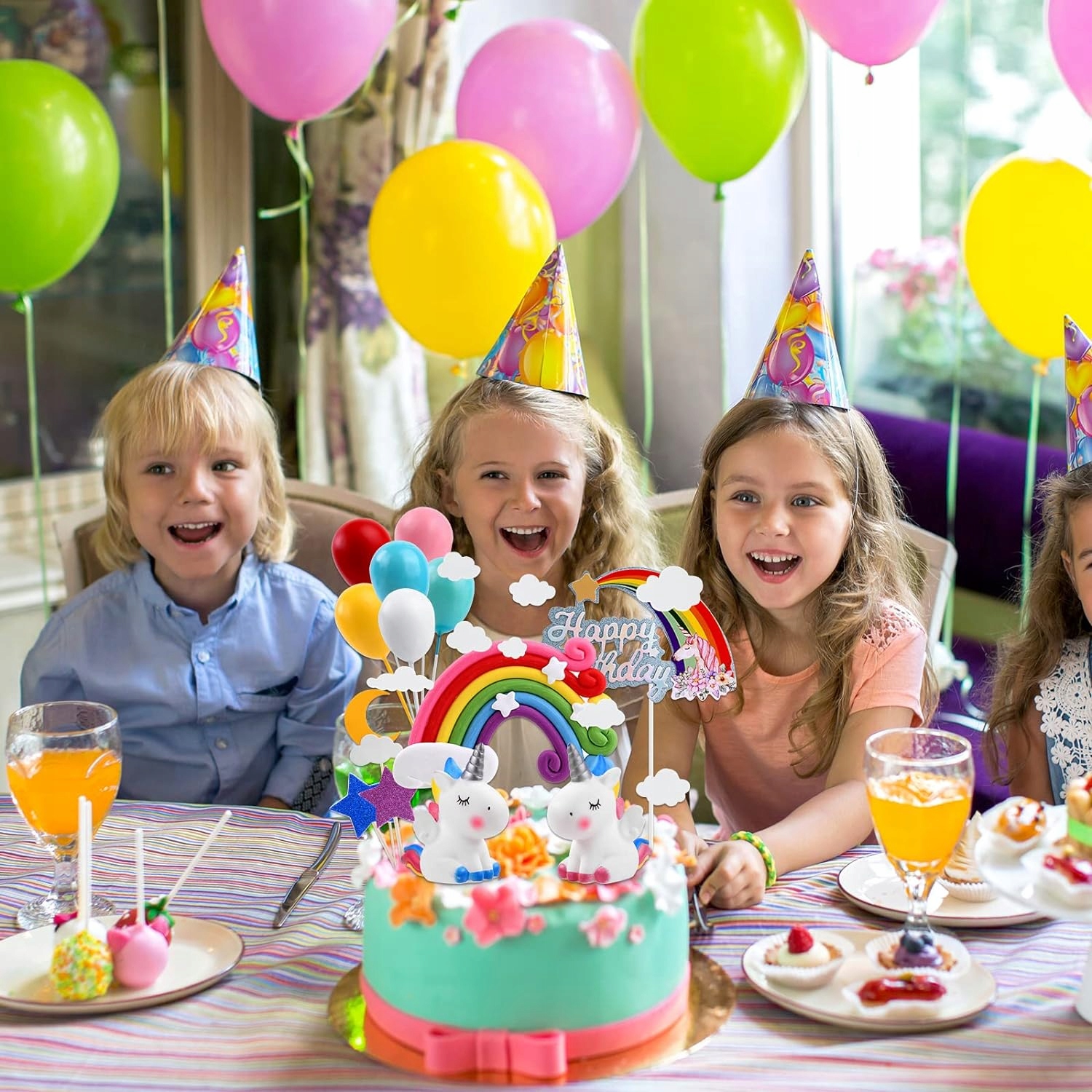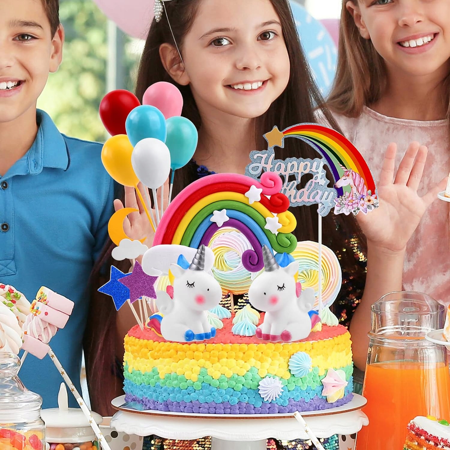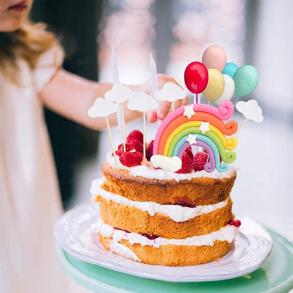 🦄 Набор для украшения торта на день рождения «Единорог»: в комплект входят облака, 6 разноцветных воздушных шаров, 2 милых единорога, 1 радужная 3D-открытка, 4 бумажные карточки (звезды, луна, облака). Очаровательные игрушки-единороги можно использовать как в качестве украшения, так и в качестве игрушки для детей.