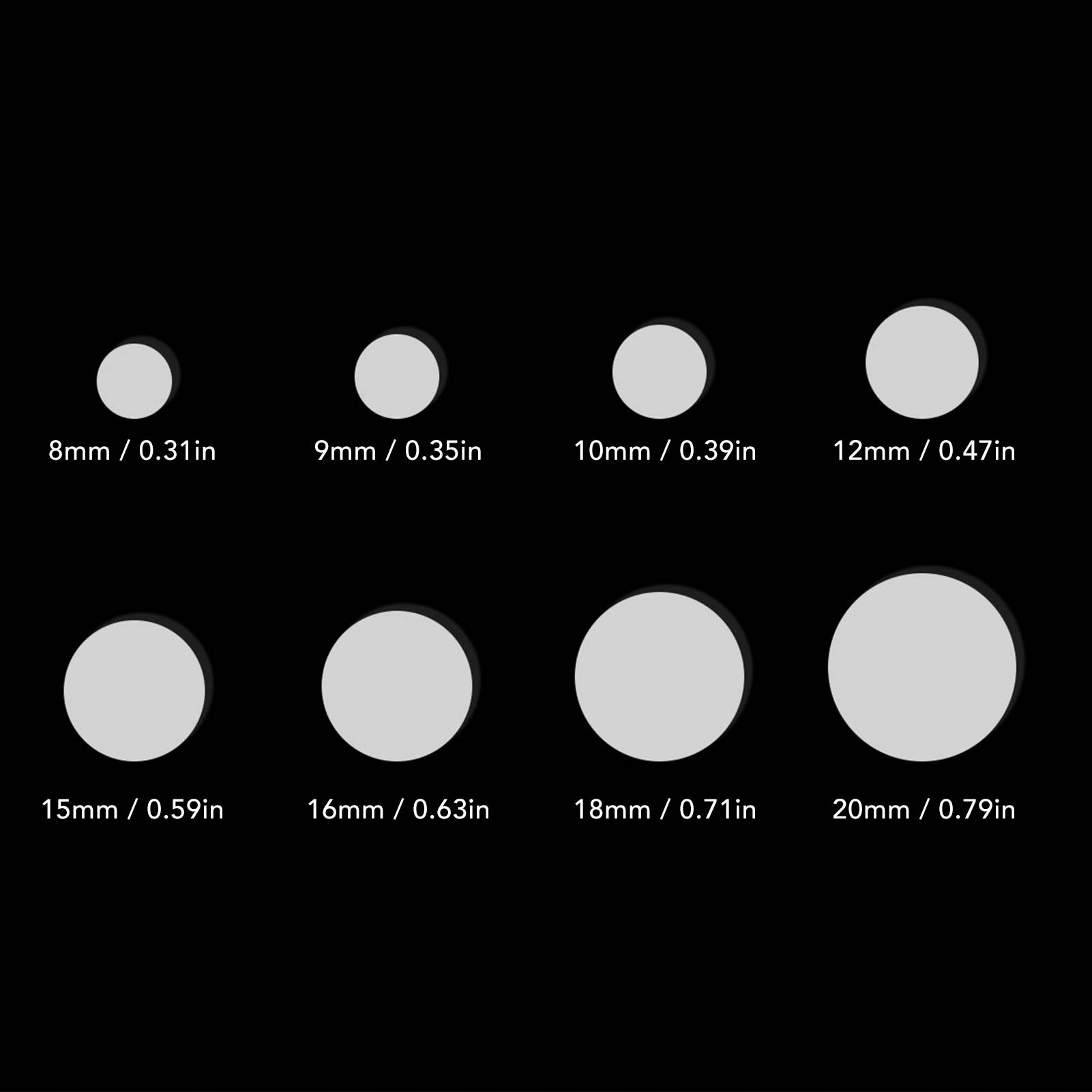 Размеры круглых отверстий: Диаметр. 8 мм/0,31 дюйма, диам. 9 мм/0,35 дюйма, диам. 10 мм/0,39 дюйма, диам. 12 мм/0,47 дюйма, диам. 15 мм/0,59 дюйма, диам. 16 мм/0,63 дюйма, диам. 18 мм/0,71 дюйма, диам. 20 мм / 0,79 дюйма
