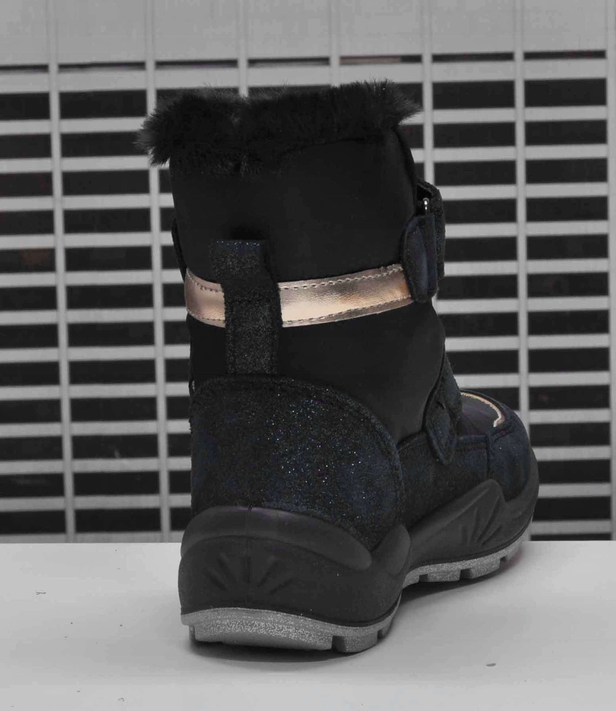 Предложение от итальянской компании Primigi. Обувь из кожи, утепленная мембраной Gore-tex, задачей которой является поддержание соответствующей температуры и обмен водяного пара внутри обуви. Используемые материалы предотвращают попадание воды внутрь.Цвет: темно-синий с вкраплениями золота