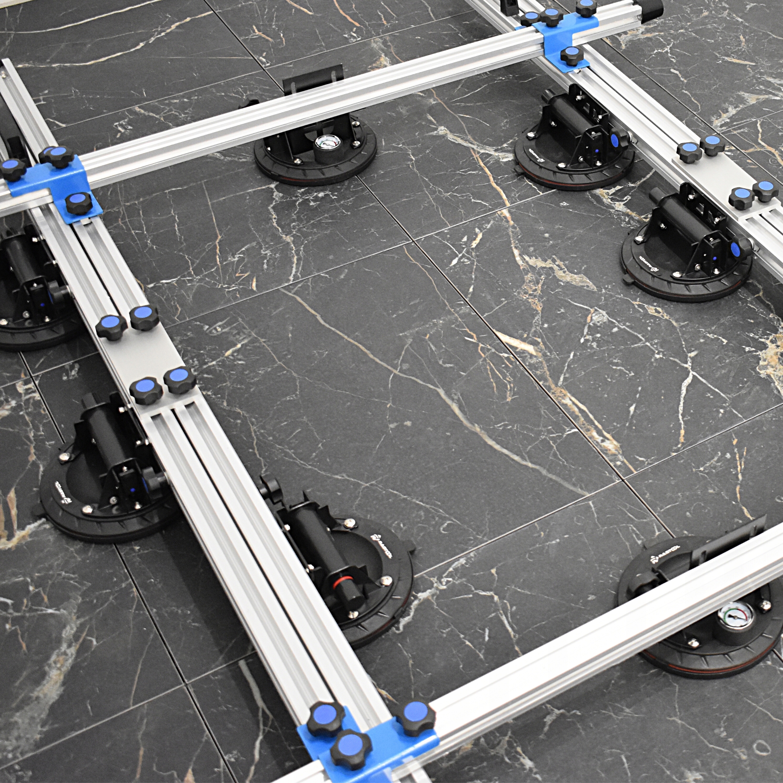 Универсальная система держателей/присосок (несущая рама) от RASTOOL. Предназначен для безопасной транспортировки и укладки крупноформатной плитки, кварцевого агломерата, керамогранита. Кроме того, его также можно использовать для транспортировки, например, стекла, ламинированных плит, листового металла.