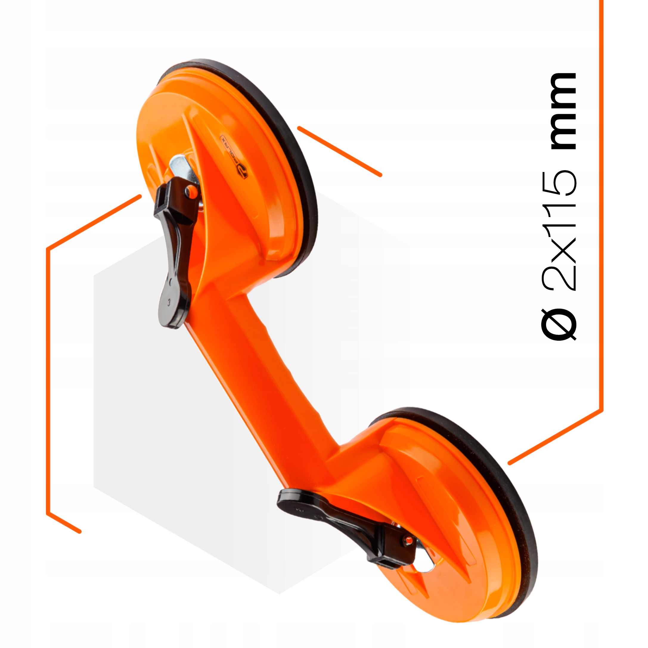 Две мощные присоски диаметром 2×115 мм обеспечивают сильный вакуум, позволяющий переносить грузы весом до 70 кг. Корпус выполнен из ударопрочного АБС-пластика, а эргономичная ручка гарантирует удобный хват. Блокировка осуществляется с помощью удобных рычагов.