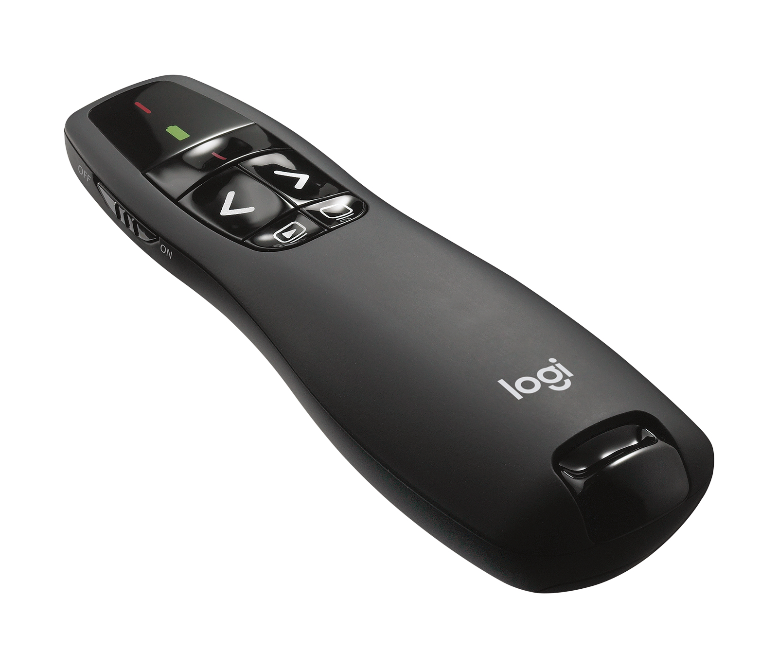 Logitech R400 - это функциональное устройство, указывающее интуитивное расположение кнопок, оснащенных красным лазерным индикатором для облегчения презентации даже в очень темных комнатах.