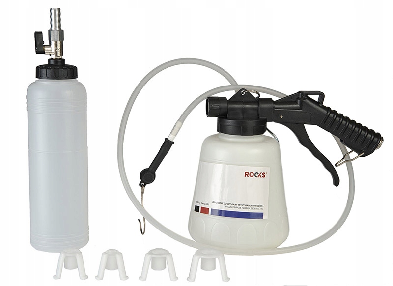 Конструкция: вакуумный контейнер с патрубками/переходниками, обеспечивающими работу большинства тормозных систем, и контейнер для дозаправки тормозной жидкости.