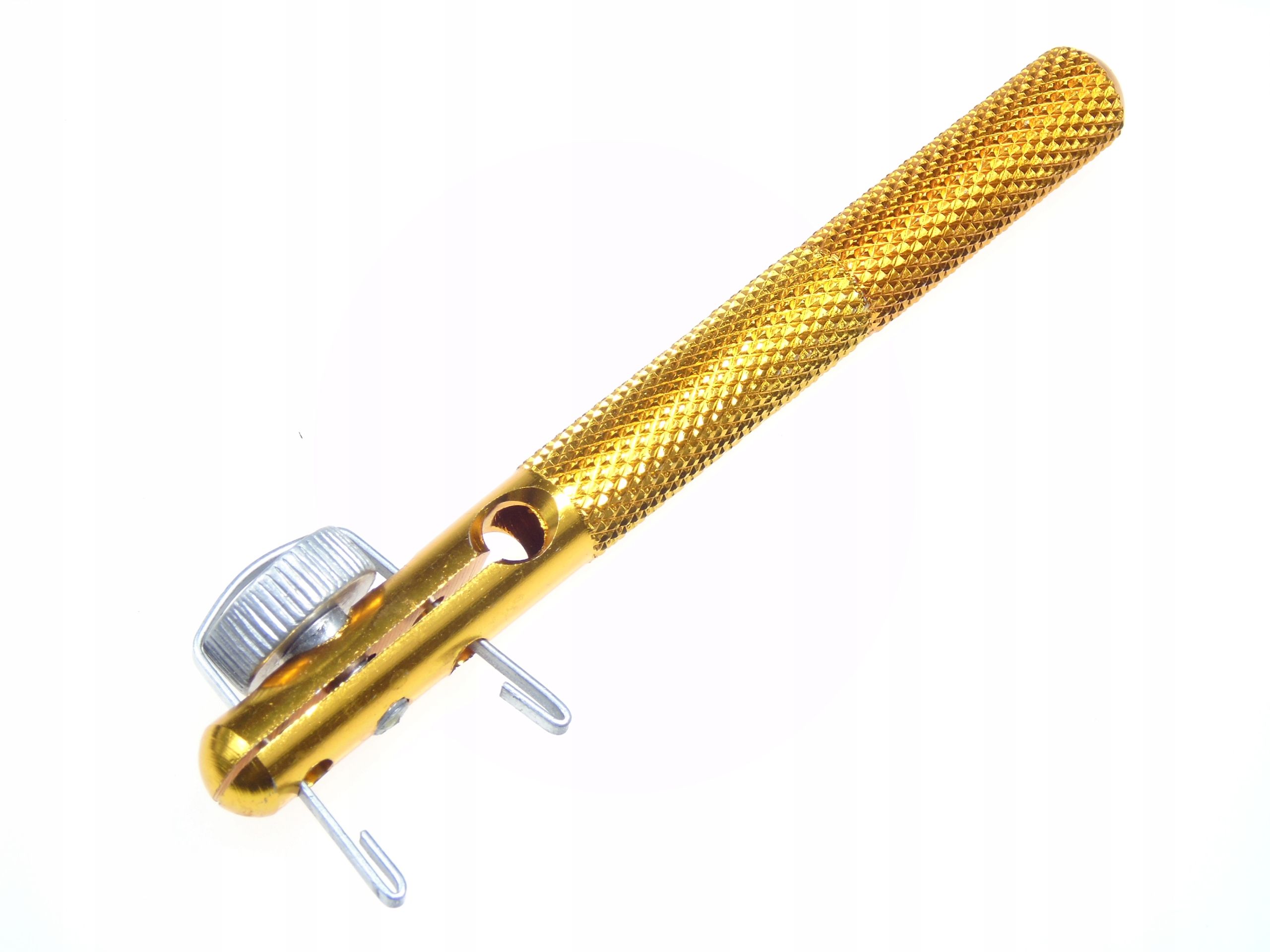 Инструмент, облегчающий привязывание крючков к шпателю. Удобный, простой в использовании, изготовлен из дюралюминия. Дополнительно две спицы (длиннее и короче) будут использоваться для быстрого провязывания ровных петель и крючков с ушком.