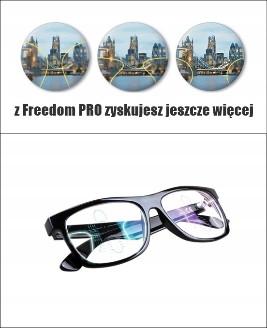 Freedom PRO — это совершенно новое решение. прогрессивная линза с возможностью персонализации в 3D-технологии. Freedom PRO означает зрение, максимально приближенное к естественному, с минимальными ошибками изображения, с расширенным более чем на 100 % каналом непрямого зрения и самой широкой зоной для близи. При производстве использовались инновационные технологии, благодаря которым каждая линза подвергается процессу оптимизации толщины края и центра линзы для получения наилучшего результата даже при больших увеличениях. Линзы Freedom PRO являются торическими (двойными асферическими), благодаря чему приобретают дополнительную эстетику и толщину. Используя разную длину прогрессивных каналов, его можно установить в любую раму (даже очень узкую) с максимальным визуальным комфортом. Прогрессивные линзы Freedom PRO отвечают самым высоким требованиям людей, носящих очки, а именно сочетают в себе характеристики идеального, неограниченного зрения с потрясающим внешним видом.