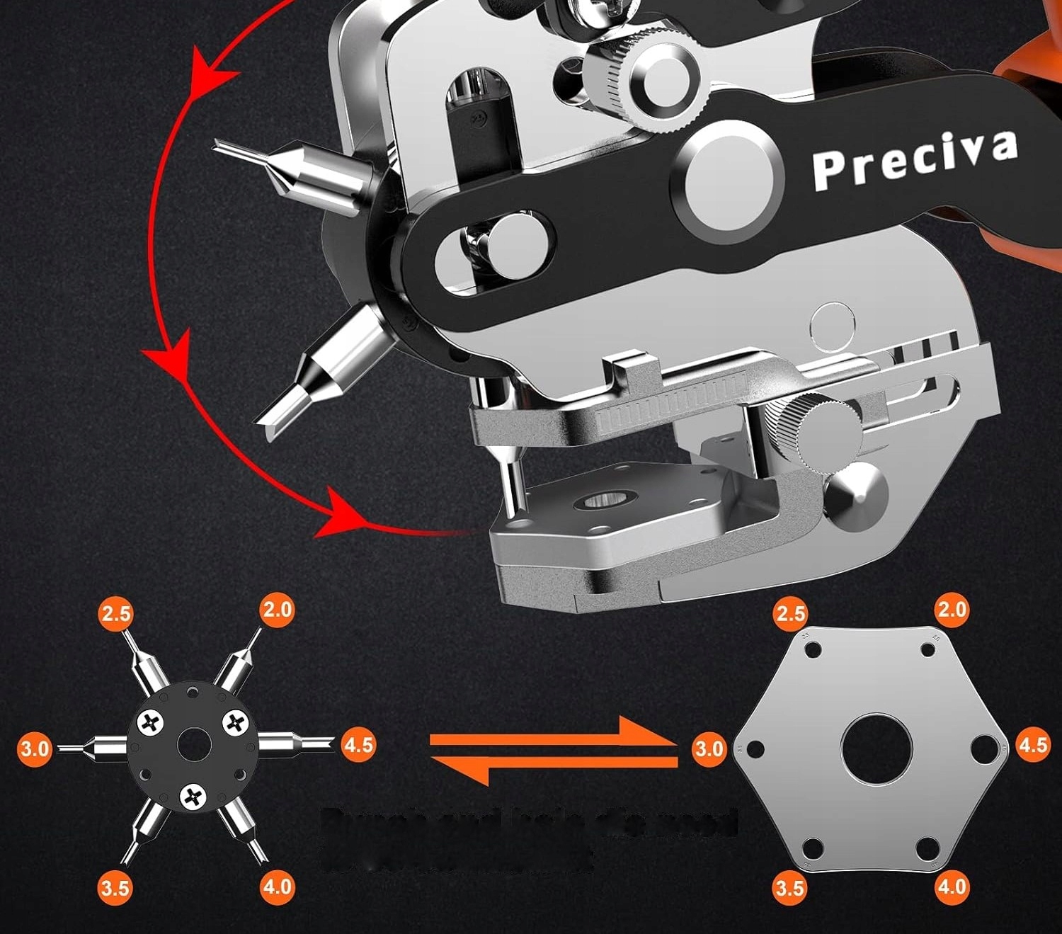 - ✅ Несколько размеров отверстий: Инструмент предлагает шесть различных размеров отверстий (2 мм, 2,5 мм, 3 мм, 3,5 мм, 4 мм и 4,5 мм), которые можно легко переключать. который идеально подходит для мастеров и любителей DIY.