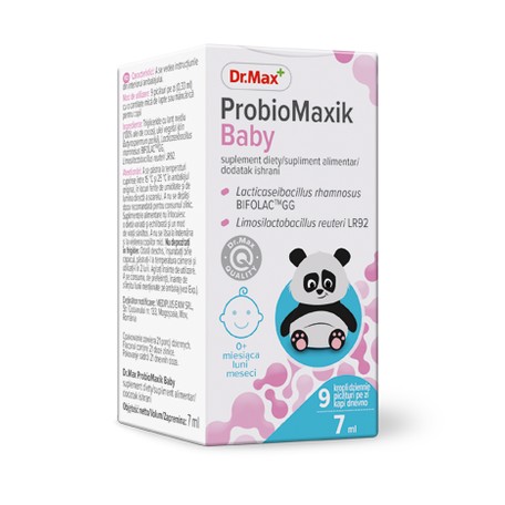 ПробиоМаксик Бэби Доктор Макс, биологически активная добавка, капли 7 мл — препарат для детей, содержащий бактериальные культуры Lacticaseibacillus rhamnosus BIFOLACTMGG и Limosilactobacillus reuteri LR92.