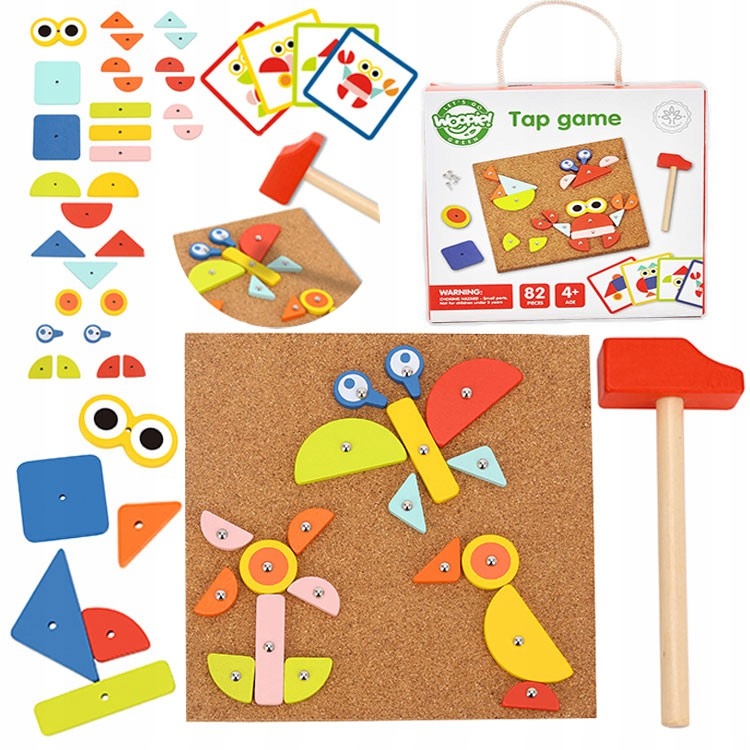 Пробковый гвоздезабиватель от бренда WOOPIE из серии GREEN – идеальная развивающая игрушка для небольшой конструктор b>. Набор содержит 82 элемента, в том числе: 30 блоков, 10 двусторонних карточек с 20 узорами (3 уровня сложности) для расстановки и прибивания, 40 булавок, досок и молотка. В этой игре дети пытаются воссоздать изображение/композицию по карточке, прибивая подходящие кубики разной формы и цвета, например, изображение птицы или цветка. В каждом деревянном элементе есть отверстие, и ребенок легко сможет прикрепить к доске любую фигуру с помощью булавок. Развлечение можно разнообразить игрой на запоминание и воспроизведение картинки по памяти малышом. Ребенок также может придумать свою форму/фишку – это ограничивается только творчеством и фантазией. Игрушка развивает мануальные навыки и < б>логическое мышление, воображение и творчество, концентрация и память.
