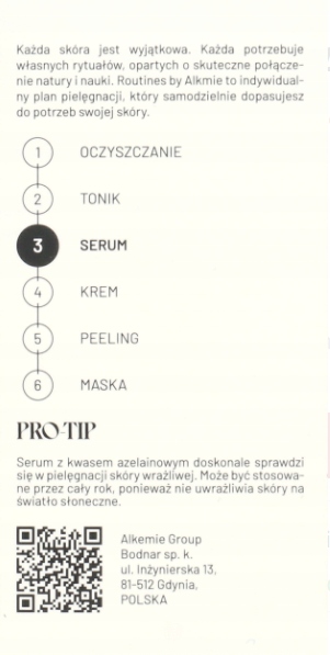Сыворотка для процедуры обесцвечивания Alkmia с азелайской кислотой и уникальной состав растительных экстрактов. Это уменьшает образование недостатков, снижает видимость пор и регулирует секрецию кожного сала. Кроме того, он увлажняет, успокаивает и сглаживает кожу. Это также будет работать на уходе за чувствительной кожей. Может использоваться в течение года (не чувствительность кожи к солнечному свету)