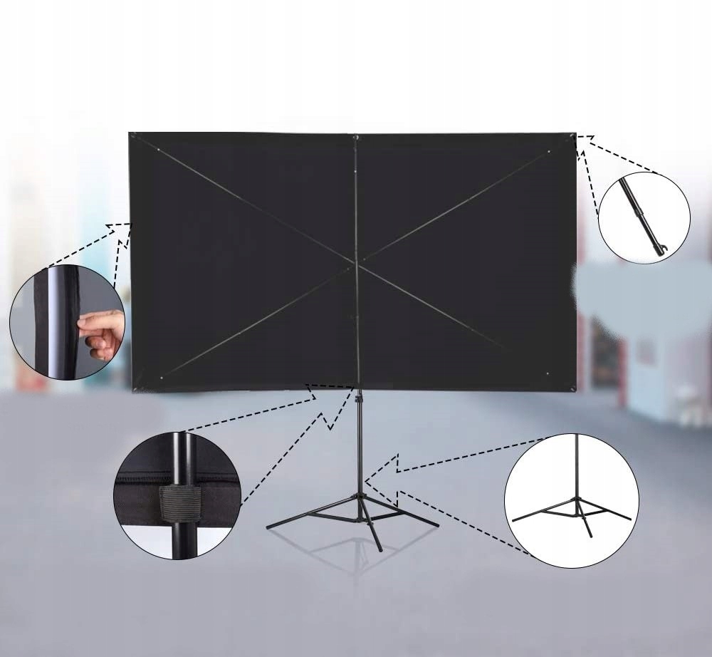 БЫСТРАЯ УСТАНОВКА В 2 МИНУТЫ: Легкий экран проектора установлен на прочном штативе с широкими ножками, что обеспечивает надежность и безопасность для вашего комфорта. Проекционный экран для внутреннего и наружного применения крепится практичными натяжными ремнями, его можно носить во дворе или в зрительном зале.