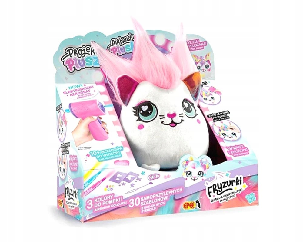 с помощью электронного аэрографа в форме фена. Это так просто! Приклейте трафарет и с помощью спрея создайте фантастические узоры. Ты даже можешь покрасить ему волосы и создать сумасшедшую прическу! А после игры просто постирайте его и начните заново.