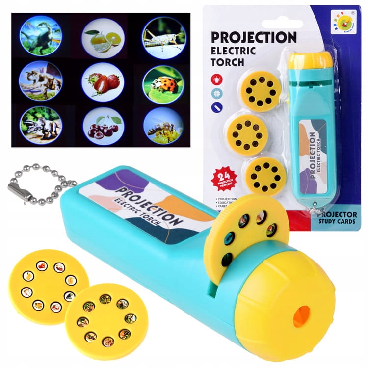Детский проектор с красочными картинками для проецирования в темноте. Благодаря небольшому размеру он удобен и всегда можно взять его с собой. Ручной проектор будет использоваться во время вечерних игр, рассказывания историй и создания собственных историй. В проекторе есть 3 диска со слайдами, на каждом до 8 картинок на разную тему. В первом есть динозавры, во втором — насекомые, а в третьем — фрукты. Не прикрепляя слайды, игрушку можно использовать как фонарик.