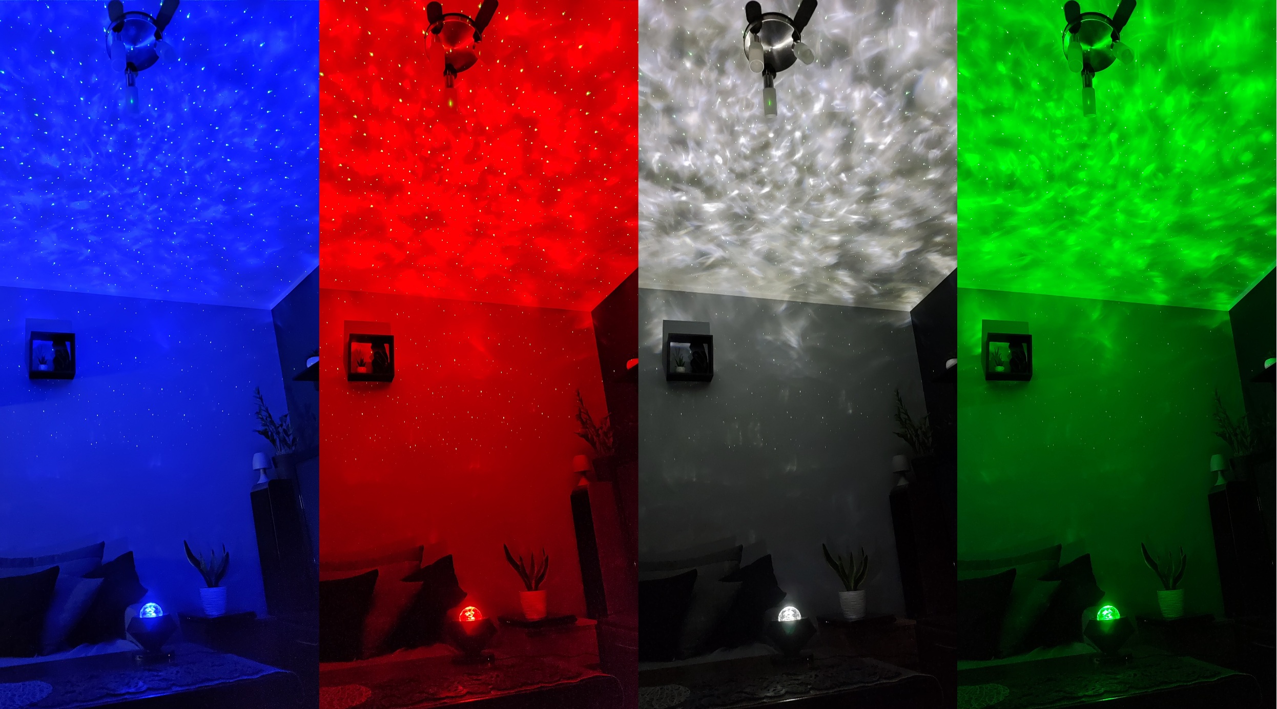 ✔️ Наш проектор имеет четыре цвета светодиодной подсветки; красный, зеленый, синий и белый, которые можно отображать по отдельности или комбинировать два цвета одновременно для создания собственных световых комбинаций.