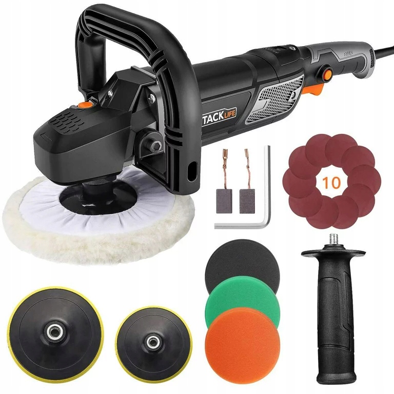+ более 20 аксессуаров в комплекте (2 диска на липучке) 150 мм и 180 мм, 3 губки разной жесткости, 1 шерстяная полировальная подушечка, 2 ручки, 2 угольные щетки, 10 наждачной бумаги 180 мм Р120, шестигранный ключ)
