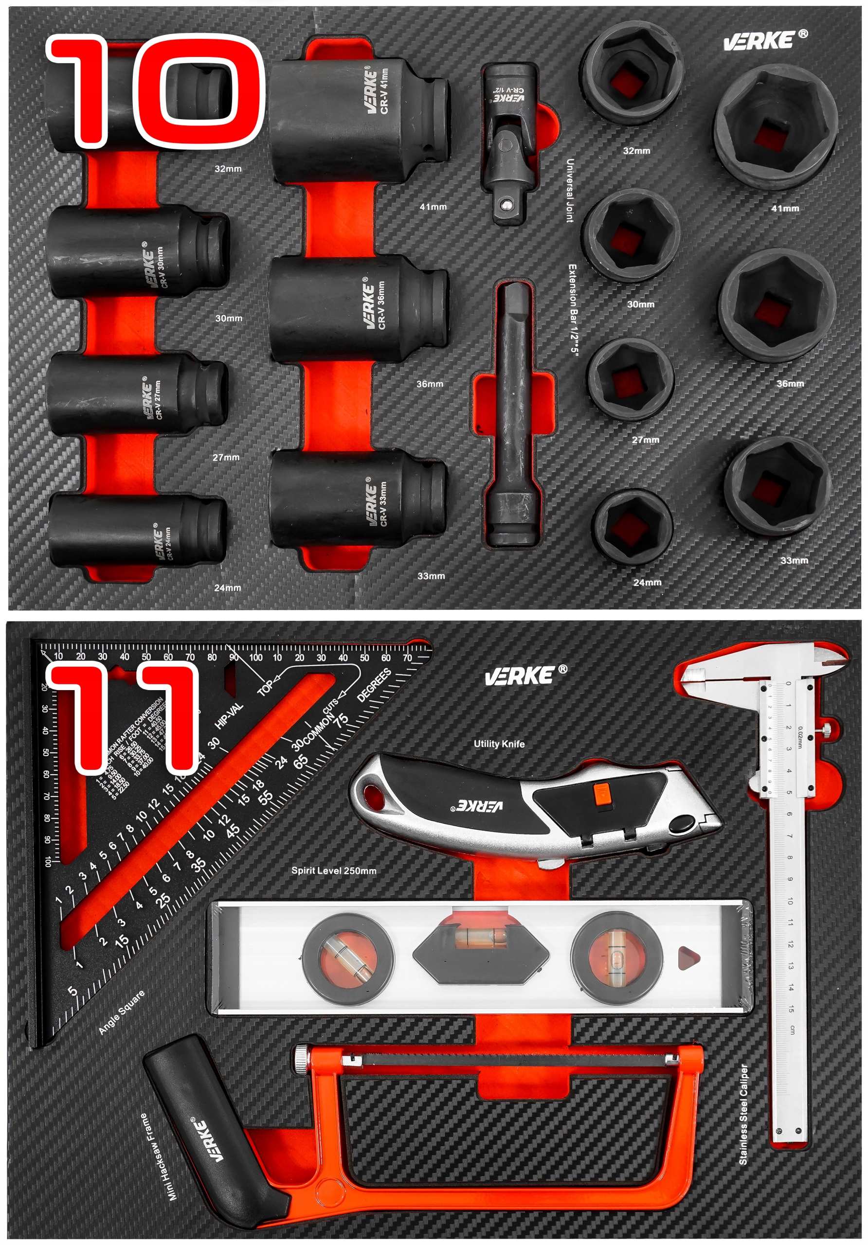 7 шт. — 6-гранная ударная головка длиной 1/2 дюйма: 24, 27, 30, 32, 33, 36, 41мм