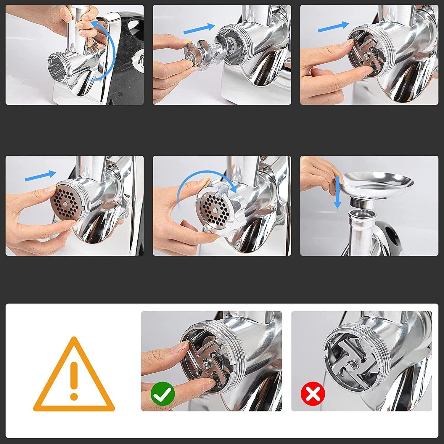 Высокое качество: Электрическая мясо -машина имеет головку и миску из алюминия, лезвия и шлифовальных пластин, изготовленных из 304 из нержавеющей стали, чистого медного двигателя, трехстороннего спирального вала для мясо -машины и безопасного корпуса пресса, обеспечивающего прочность и долговечность. Для вас и вашей семьи, которые любят делать измельченное мясо, вы можете использовать его с уверенностью.