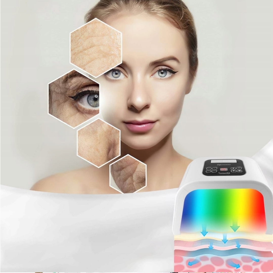 разные режимы использования: светодиод 7 в 1 косметических устройствах могут контролировать цвет света и времени ухода за кожей, используя кнопку вверху. 7 различных светлых цветов, подходящие для разных типов кожи. Красный свет поддерживает производство коллагена, синий свет помогает в борьбе с прыщами и обесцвечиванием, зеленый свет успокаивает и восстанавливает баланс кожи.