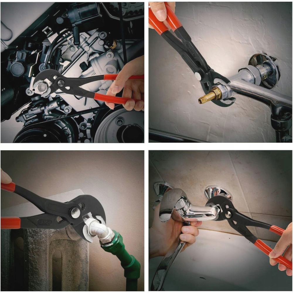 Регулируемые клещи длиной 310 мм изготовлены из высококачественной стали CR-V, устойчивы к истиранию и долговечны. V-образные губки обеспечивают надежный захват плоских, круглых, квадратных и шестиугольных предметов. Эргономичные прорезиненные ручки гарантируют комфорт работы и снижают усталость рук. Идеально подходит для сантехнических, монтажных и домашних работ.